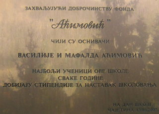 Василије Аћимовић, бивши ученик наше школе и његова супруга Мафалда, оснивачи су фонда ,, Аћимовић ". Циљ Фонда ,, Аћимовић " је да помогну паметној и способној деци да наставе даље школовање уз стипендију. Од школске 2005/2006. године и наши ученици су стипендисти овог Фонда.
